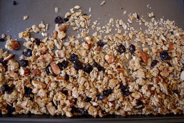 Next in a large heavy bottomed pot add the last 6 ingredients. Be sure the pot is large enough to hold all ingredients. Slowly heat the honey mixture until all the ingredients are blended. Next add all the toasted ingredients. At this time you may also add the cranberries. Stir the granola mixture with a heavy wooden spoon. You want to guarantee all the oats get covered with the honey blend. Once everything is coated, dump the granola onto a buttered baking sheet or one with a silpat. Bake for 20 minutes, but be sure to stir at the halfway point. As the granola is cooling be sure to stir it a few times so it doesn’t clump.