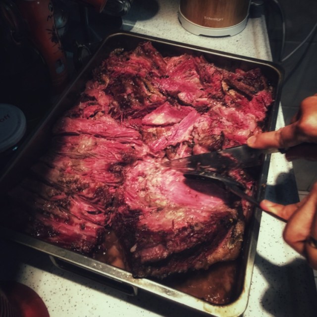 After boiling the meat I like to put it in a roasting pan and roast it fat side up for about 30 minutes at 350˚F to get the fat nice and caramelized.