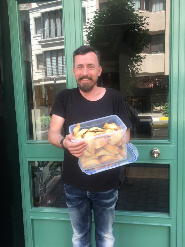 Şeref with his Bayram haircut, empanadas in tow.