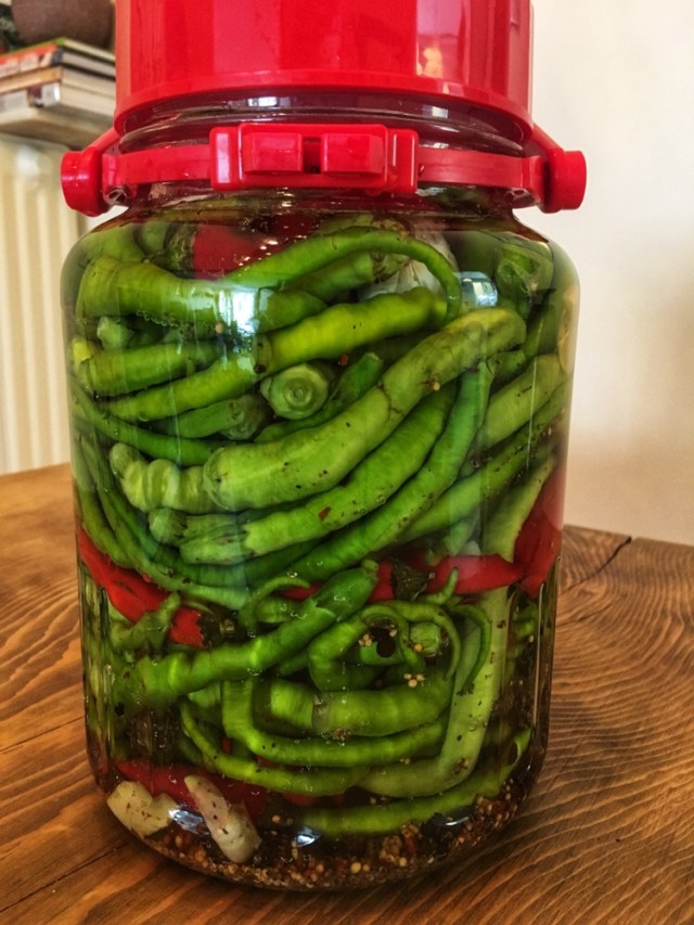 As mentioned in a previous post, my in-laws are currently staying with me and my father-in-law really enjoys going to the market. He likes to buy things in great quantity. Recently when he had the feeling that the price of potatoes and onions was going to go up, he started to stockpile kilos and kilos of them. This was stressful because I had to rearrange my entire pantry to accommodate them but also, with enough potatoes and onions to feed a small army, I began to question if there was a timeline for when they may leave! We have staples to last well into fall.. When he came home with 6 kilos (13.2 pounds!) of green ‘sivri’ peppers I got to pickling.