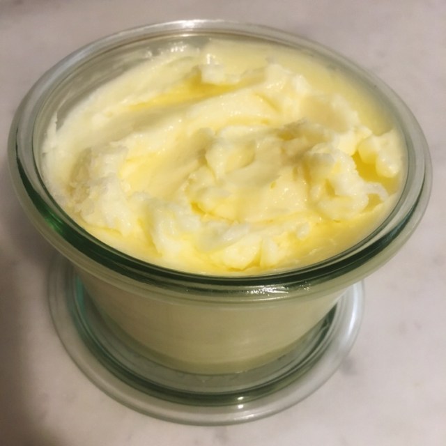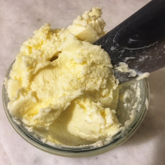 Once the kefir has fermented the cream it will have reached a thick yogurt-like consistency. Add a pinch of salt for flavor. You now want to take a hand mixer and whip the cream until the whey has separated and the result will be butter. Don’t toss the whey! It has lots of good probiotics. You can drink it straight, add it to soup or make pancakes or biscuits among other things.