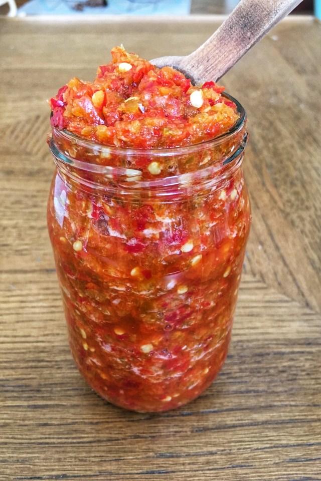 . These sauces are used to enhance various meat dishes and even fish and vegetables. The red pepper relish called ajika is popular in the region for adding heat to pasta. When I saw that neither of my traveling companions were interested in the ajika, I happily claimed it as my own. It had been a few months since our trip, and my stash was running low. So I decided I had better attempt to recreate it. I am pleased to say that while I knew my pepper blend would be a little different, the method and flavor seemed to be spot on. Ajika is a popular condiment in Azerbaijan and all of the neighboring countries as well. Each recipe I read was a little different as it would be from country to country, even household to household. Some use tomatoes, carrots, vinegar and various herbs or spices. I even read one that added apples. This method is inspired by the Azerbaijani man by the bridge in the tiny town of İlisu and for that I thank him.
