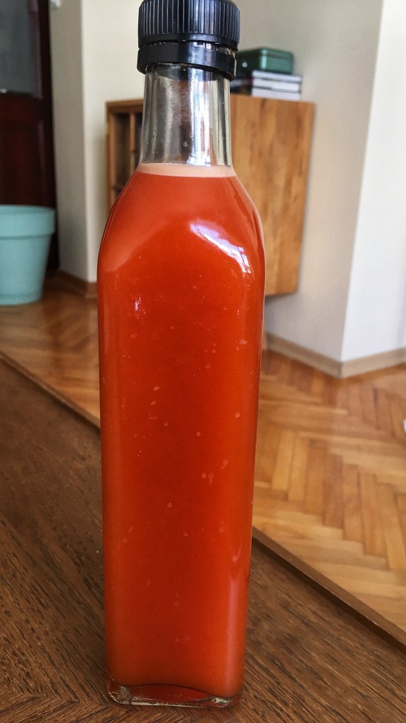Wait at least a month to develop the best flavor. After a month (or longer if you aren’t impatient like me) toss the whole mix in a blender and blend for about 30 seconds. You don’t want a totally smooth puree. Strain to separate the ajika from your bonus hot sauce! You can either keep the hot sauce or gift it to friends in little bottles. They will be impressed!